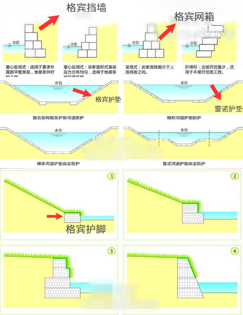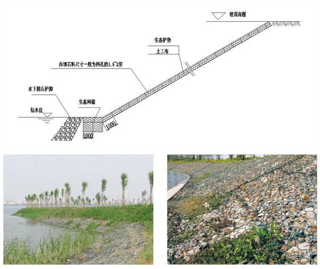 雷諾護墊是厚度在0.17-0.3m的網(wǎng)箱結構,在現(xiàn)場用于裝填石頭。主要用作河道、岸坡、路基邊坡護坡結構。既可防止河岸遭水流、風浪侵襲而破壞,又實現(xiàn)了水體與坡下土體間的自然對流交換功能,達到生態(tài)平衡。坡上植綠可增添景觀、綠化效果。